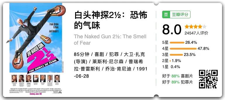 《白头神探2½:恐怖的气味》(The Naked Gun 2½: The Smell of Fear,1991)。