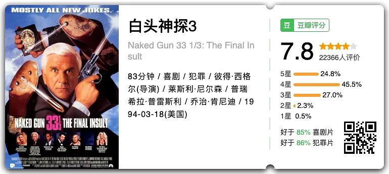 《白头神探33⅓:终极侮辱》(Naked Gun 33⅓: The Final Insult,1994)。