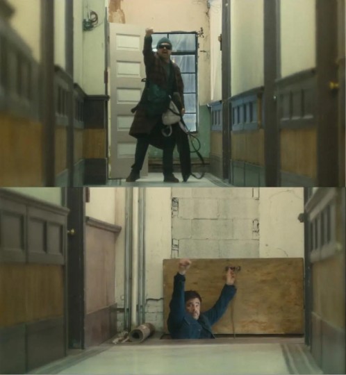 若说先前对左派的刻画还停留在暗戳戳的讽刺层面,要靠观众通过画面细节自行想到其中的微言大义的话,那银行枪杀保安的一幕就已赤裸裸地揭穿了“革命”的本质。