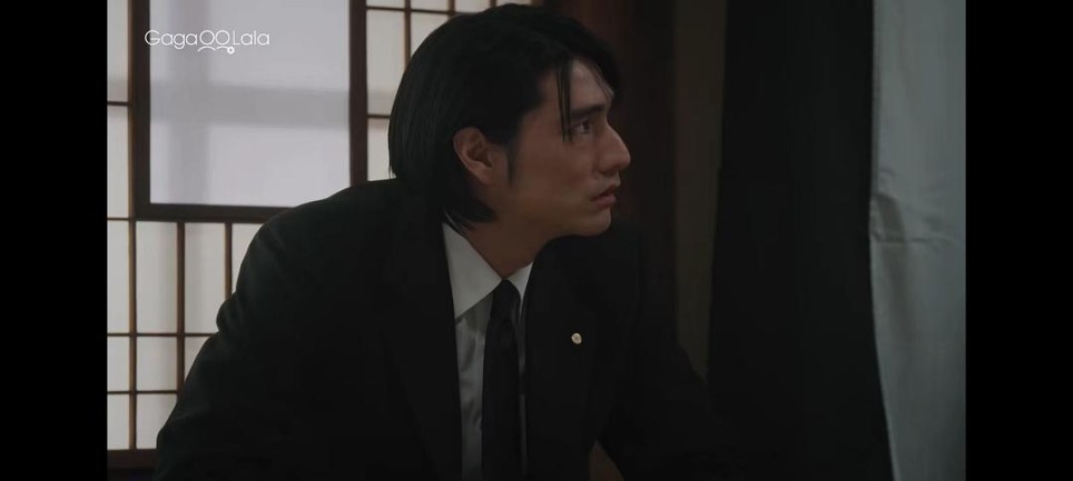但是剧版呈现的方式很奇怪,它看起来像是四代目给混在人群后面的杀手递了个眼色示意开始行动,然后自己就缩到后面去了(不是大哥,这么多人看着呢?你这么整真的好吗?),杀手就开始杀攻(而此时攻就坐在四代目的亲妈大姐头身边,就以他这个枪法,四代目你不怕他打中你亲妈吗?),打了第一枪偏了,打到了榻榻米上,小弟们开始一拥而上抢枪,开始了那个漫长又离谱的动线(这个前面已经吐槽过了就不重复了)……整个混乱的枪战看起来就像是为了染血初吻那碟醋包的饺子,导演想要利用自然光打到攻受的脸上塑造出一种神圣感,这样吻起来会很好看,