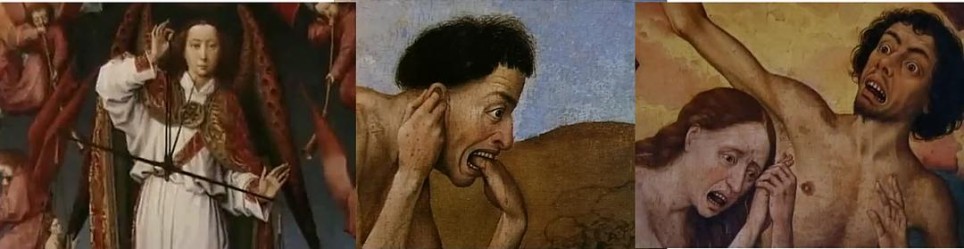凡·德尔·维登所绘的《最后的审判》中,迈克尔大天使称重量宣布死的契约,重量较轻的将被复活,重的打入地狱。在威严的天平下,有人奔逃、有人被活埋、有人啃食自己的手,并且正准备撕下自己的耳朵。如今,天使远离了我们的世俗生活,可是生灵涂炭的情形从未消失。瓦尔达的镜头游移在一张张痛苦的脸之间是在提问:现在,审判我们的是谁?